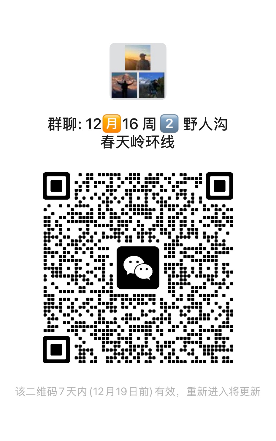 进群流程:搜旅徒户外俱乐部小程序一点我的一点活动订单一点开出行活动订单一点击扫码加入活动微信群,也可以联系客服有山(youshan09)拉进群