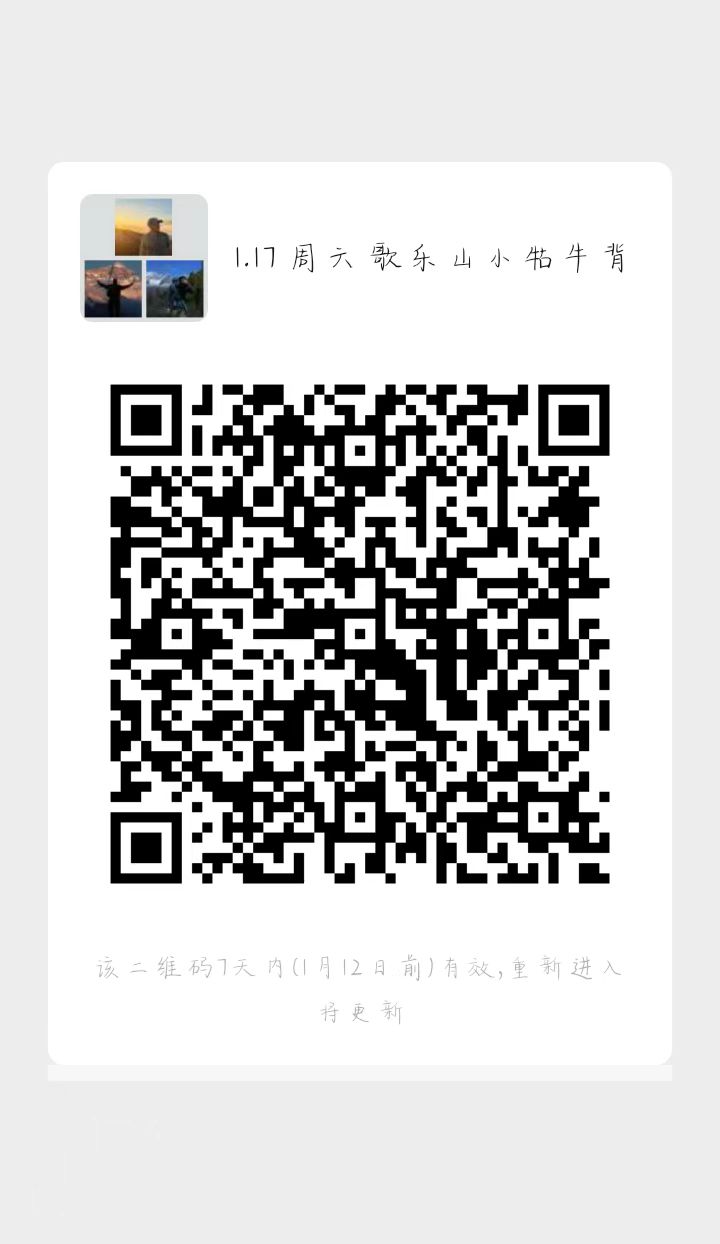 进群流程:搜旅徒户外俱乐部小程序一点我的一点活动订单一点开出行活动订单一点击扫码加入活动微信群,也可以联系客服有山(youshan09)拉进群