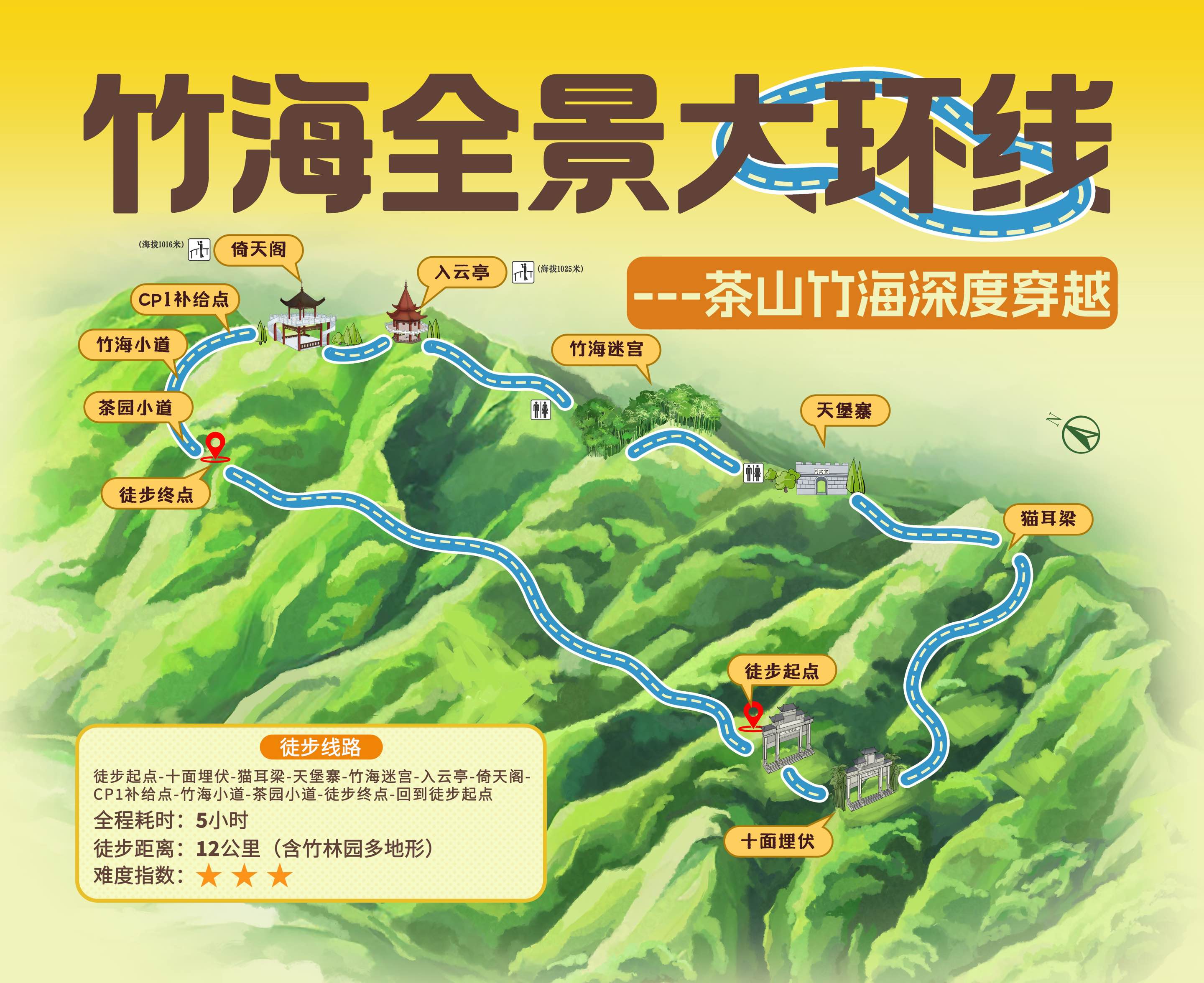 全程距离:约12公里(含竹林、石阶、土路、茶园小径等多变地形)
