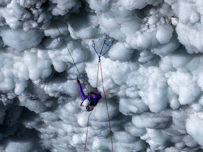 冰质判断:选择表面稍软、里层较硬的冰壁,避免攀登冰挂、冰柱等不稳定结构,尤其在阳光直射或天气异常温暖时。