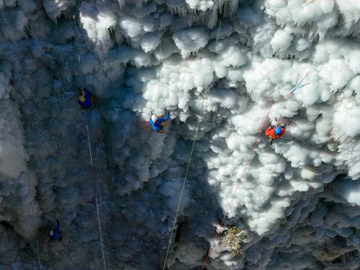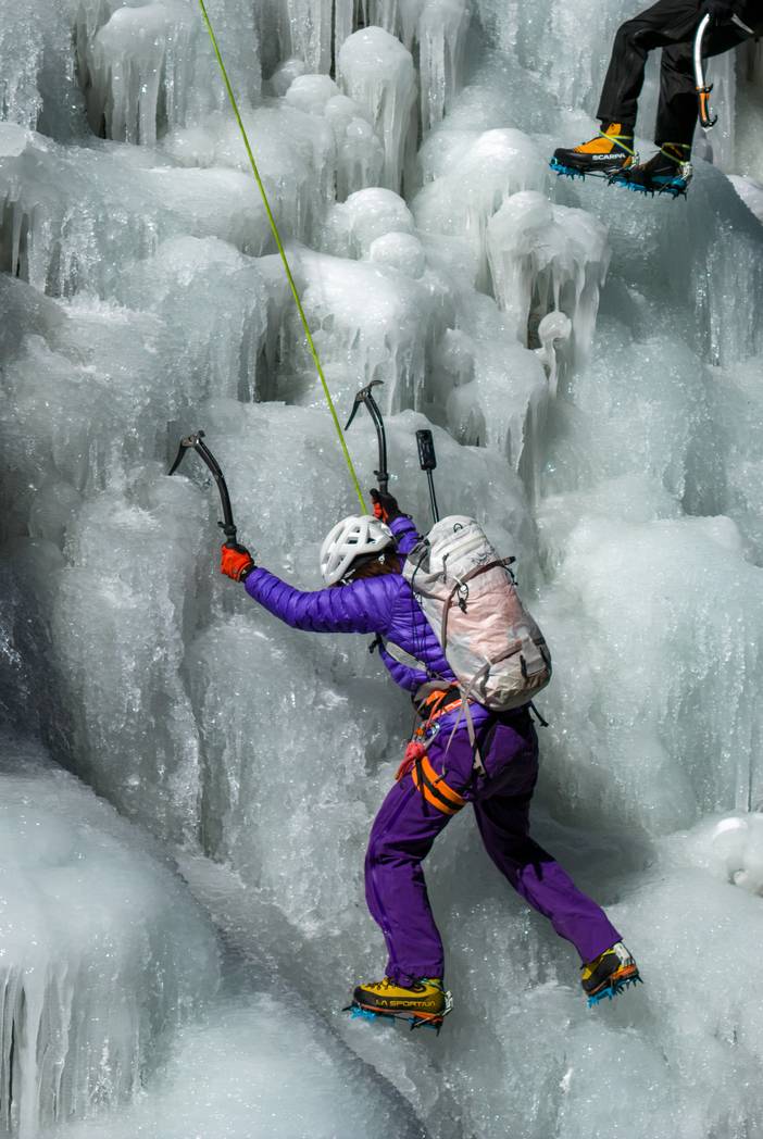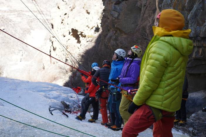 保护区域安全:不在冰镐、冰爪可能坠落的范围内做保护,冰块坠落时及时提醒他人。