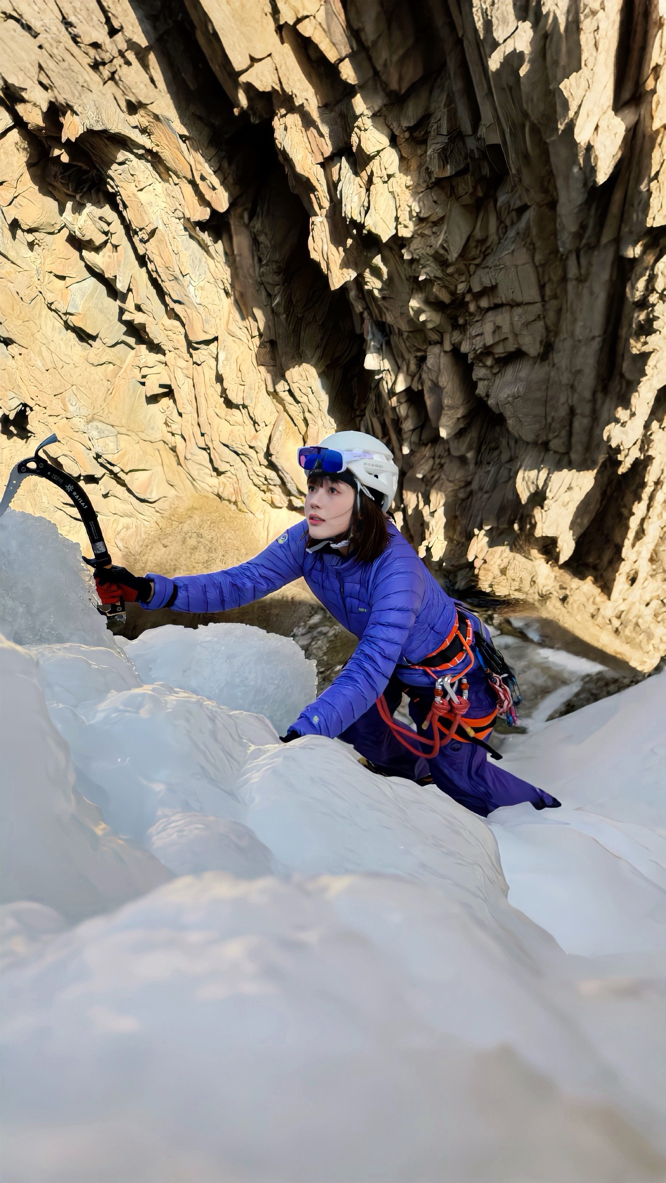动作要点:保持膝盖微弯,避免用力过猛,确保冰镐和冰爪稳固插入冰面,减少体力消耗。